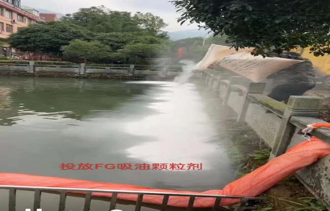 立即采用物理吸附環(huán)保模式,開(kāi)展水上清污作業(yè)。首先從池塘出口處布放吸油拖欄,有效阻截水面污染物向下游擴(kuò)散。同時(shí)往水里拋散潔白的FG吸附顆粒劑進(jìn)行吸附。為了防止化學(xué)物質(zhì)滲透蔓延,董隊(duì)又建議將FG吸附顆粒留置在池塘水面,隔日打撈。