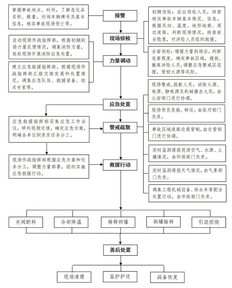 統(tǒng)計(jì)數(shù)字顯示,我國95%的危險(xiǎn)化學(xué)品涉及異地運(yùn)輸問題,由此引發(fā)的公路運(yùn)輸事故占到了危險(xiǎn)化學(xué)品事故總數(shù)的30%-40%,裝運(yùn)危險(xiǎn)化學(xué)品的槽(罐)車在其中占了絕大多數(shù)。一旦發(fā)生危險(xiǎn)化學(xué)品槽(罐)車運(yùn)輸事故,應(yīng)按照以下流程和措施進(jìn)行應(yīng)急救援處置,處置中需要落實(shí)以下注意事項(xiàng)和防護(hù)要求: