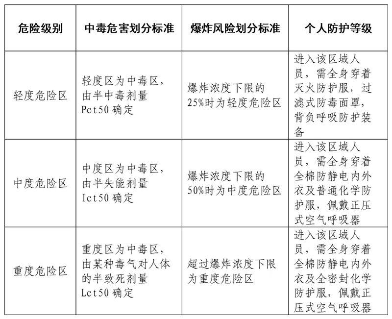 對(duì)于存在有毒物質(zhì)的現(xiàn)場(chǎng),毒害區(qū)域劃定一般依據(jù)有毒氣體對(duì)人體的損害程度,劃分為輕度危險(xiǎn)區(qū)、中度危險(xiǎn)區(qū)、重度危險(xiǎn)區(qū)三個(gè)區(qū)域。